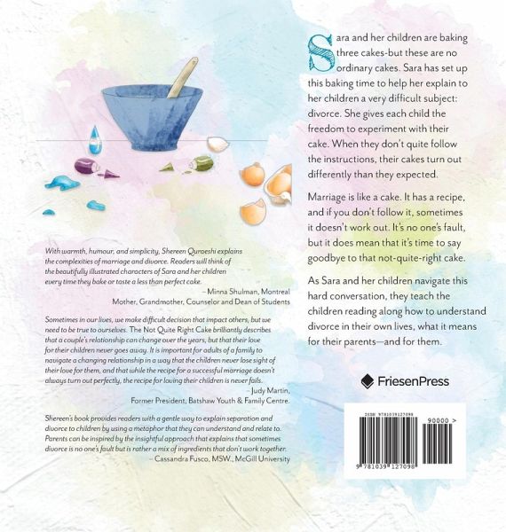 Sara and her children are baking three cakes-but these are no ordinary cakes. Sara has set up this baking time to help her explain to her children a very difficult subject: divorce. She gives each child the freedom to experiment with their cake. When they don't quite follow the instructions, their cakes turn out differently than they expected. Marriage is like a cake. It has a recipe, and if you don't follow it, sometimes it doesn't work out. It's no one's fault, but it does mean that it's time to say goodbye to that not-quite-right cake. As Sara and her children navigate this hard conversation, they teach the children reading along how to understand divorce in their own lives, what it means for their parents-and for them.