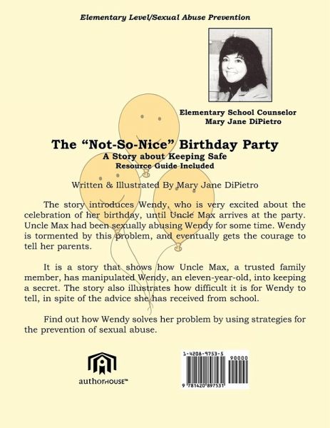 The "Not-So-Nice" Birthday Party A Story about Keeping Safe Resource Guide Included Written & Illustrated by Mary Jane DiPietro The story introduces Wendy, who is very excited about the celebration of her birthday, until Uncle Max arrives at the party. Uncle Max had been sexually abusing Wendy for some time. Wendy is tormented by this problem, and eventually gets the courage to tell her parents. It is a story that shows how Uncle Max, a trusted family member, has manipulated Wendy, an eleven-year-old, into keeping a secret. The story also illustrates how difficult is it for Wendy to tell, in spite of the advice she has received from school. Find out how Wendy solves her problem by using strategies for the prevention of sexual abuse.