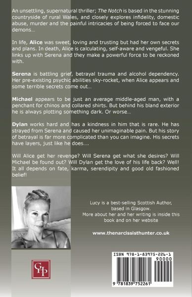An unsettling, supernatural thriller; The Notch is based in the stunning countryside of rural Wales. Through the four main characters the book closely explores infidelity, domestic abuse, murder and the painful intricacies of being forced to face our demons... Will Alice get her revenge? Will Serena get what she desires? Will Michael be found out? Will Dylan get the Love of His life back? The Notch will shock you and perhaps even have you re-evaluating your own moral compass and life choices. Coincidence, Serendipity, Karma, Fate, Evil...let's see if they really exist.... Lucy is a best-selling Scottish Author, based in Glasgow. More about her and her writing is inside this book and on her website www.thenarcissisthunter.co.uk