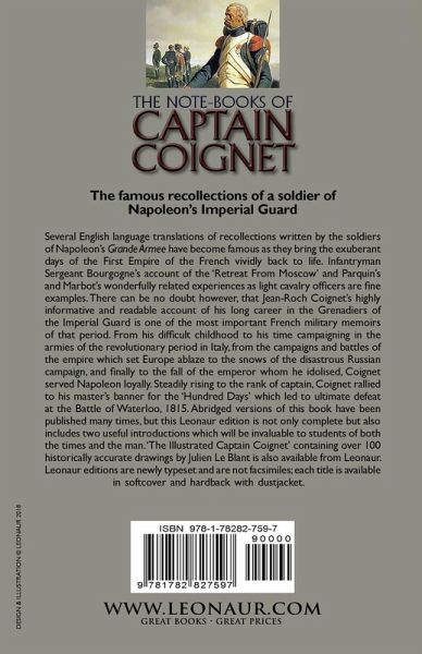 The famous recollections of a soldier of Napoleon’s Imperial Guard Several English language translations of recollections written by the soldiers of Napoleon’s Grande Armee have become famous as they bring the exuberant days of the First Empire of the French vividly back to life. Infantryman Sergeant Bourgogne’s account of the ‘Retreat From Moscow’ and Parquin’s and Marbot’s wonderfully related experiences as light cavalry officers are fine examples. There can be no doubt however, that Jean-Roch Coignet’s highly informative and readable account of his long career in the Grenadiers of the Imperial Guard is one of the most important French military memoirs of that period. From his difficult childhood to his time campaigning in the armies of the revolutionary period in Italy, from the campaigns and battles of the empire which set Europe ablaze to the snows of the disastrous Russian campaign, and finally to the fall of the emperor whom he idolised, Coignet served Napoleon loyally. Steadily rising to the rank of captain, Coignet rallied to his master’s banner for the ‘Hundred Days’ which led to ultimate defeat at the Battle of Waterloo, 1815. Abridged versions of this book have been published many times, but this Leonaur edition is not only complete but also includes two useful introductions which will be invaluable to students of both the times and the man. ‘The Illustrated Captain Coignet’ containing over 100 historically accurate drawings by Julien Le Blant is also available from Leonaur. Leonaur editions are newly typeset and are not facsimiles; each title is available in softcover and hardback with dustjacket.