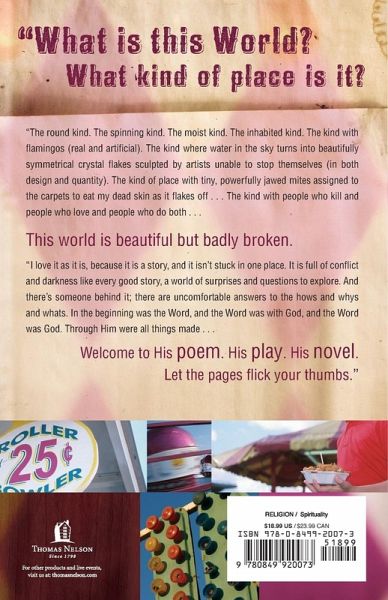 What is this World? What kind of place is it? "The round kind. The spinning kind. The moist kind. The inhabited kind. The kind with flamingos (real and artificial). The kind where water in the sky turns into beautifully symmetrical crystal flakes sculpted by artists unable to stop themselves (in both design and quantity). The kind of place with tiny, powerfully jawed mites assigned to the carpets to eat my dead skin as it flakes off . . . The kind with people who kill and people who love and people who do both . . . This world is beautiful but badly broken. "I love it as it is, because it is a story, and it isn't stuck in one place. It is full of conflict and darkness like every good story, a world of surprises and questions to explore. And there's someone behind it; there are uncomfortable answers to the hows and whys and whats. In the beginning was the Word, and the Word was with God, and the Word was God. Through Him were all things made . . . Welcome to His poem. His play. His novel. Let the pages flick your thumbs."