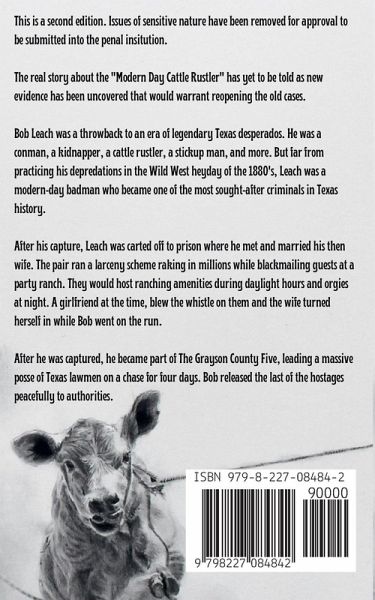 This is a second edition. Issues of sensitive nature have been removed for approval to be submitted into the penal insitution. The real story about the "Modern Day Cattle Rustler" has yet to be told as new evidence has been uncovered that would warrant reopening the old cases. Bob Leach was a throwback to an era of legendary Texas desperados. He was a conman, a kidnapper, a cattle rustler, a stickup man, and more. But far from practicing his depredations in the Wild West heyday of the 1880's, Leach was a modern-day badman who became one of the most sought-after criminals in Texas history. After his capture, Leach was carted off to prison where he met and married his then wife. The pair ran a larceny scheme raking in millions while blackmailing guests at a party ranch. They would host ranching amenities during daylight hours and orgies at night. A girlfriend at the time, blew the whistle on them and the wife turned herself in while Bob went on the run. After he was captured, he became part of The Grayson County Five, leading a massive posse of Texas lawmen on a chase for four days. Bob released the last of the hostages peacefully to authorities.