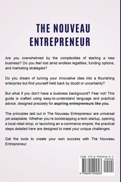 Start up and Skyrocket Your New Business to Success even if You've Never Started a Business Before! Are you overwhelmed by the complexities of starting a new business? Do you feel lost amid endless legalities, funding options, and marketing strategies? Do you dream of turning your innovative idea into a flourishing enterprise but find yourself held back by doubt or uncertainty? The journey to becoming a successful entrepreneur doesn't have to be daunting. This is precisely where "The Nouveau Entrepreneur: A Step-by-Step Guide to Start a New Enterprise" comes into play. In fact, starting and running a profitable business is easier than you think! But what if you are thinking, "I don't have a business background"? Fear not! This guide is crafted using easy-to-understand language and practical advice, designed precisely for aspiring entrepreneurs like you. Unlike other books that drown you in theory, this book provides actionable steps and real-world examples. The principles laid out in The Nouveau Entrepreneur are universal yet adaptable. Whether you're bootstrapping a tech startup, opening a local retail shop, or launching an e-commerce empire, the practical steps detailed here are designed to meet your unique challenges. Whether you have a background in business or not, you will find that this book is written in plain English and designed for clarity. It dispels the myth that business success is all about who you know and getting lucky. Instead, it provides you with the tools to create your own luck through informed strategies and diligent execution. If you're ready to turn your entrepreneurial vision into reality and start building your successful new business, The Nouveau Entrepreneur is for you!