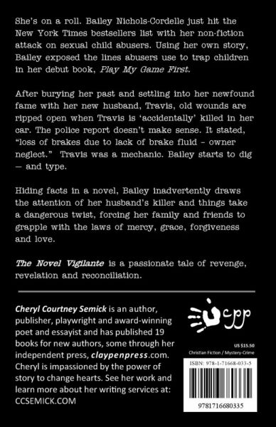 She's on a roll. Bailey Nichols-Cordelle just hit the New York Times bestsellers list with her non-fiction attack on sexual child abusers. Using her own story, Bailey exposed the lines abusers use to trap children in her debut book, 'Play My Game First.' After burying her past and settling into her newfound fame with her new husband, Travis, old wounds are ripped open when Travis is 'accidentally' killed in her car. The police report doesn't make sense. It stated, "loss of brakes due to lack of brake fluid - owner neglect." Travis was a mechanic. Bailey starts to dig - and type. Hiding facts in a novel, Bailey inadvertently draws the attention of her husband's killer and things take a dangerous twist, forcing her family and friends to grapple with the laws of mercy, grace, forgiveness and love. The 'Novel Vigilante' is a passionate tale of revenge, revelation and reconciliation.