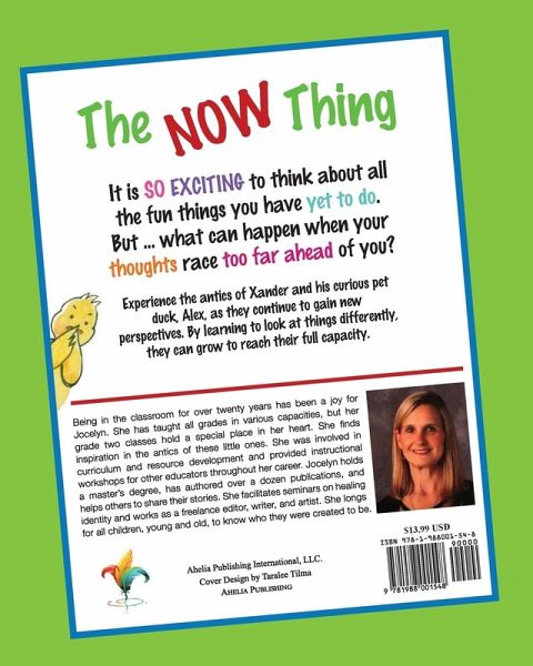 Meet Xander. He is engaging and curious. He is also not perfectly well-behaved at all times, but carries the innocence of a child learning to navigate life. The resulting mishaps and natural repercussions of Xander's antics lead him to discover better ways of thinking about and responding to the obstacles and events he encounters. The story is told in first-person, with the not so grammatically correct, but fun language of a young child. The colorful text is humorous and recognizable to parents and teachers alike, and does not shy away from larger, interesting words with which our little ones often surprise us. Keen observation of the illustrations will reveal that they serve to further the story line and add an element of excitement as kids hunt to find Alex, Xander's pet duck, often hidden or strategically placed within them! The intent of this series is to develop an awareness of how we think about and react to life's situations. This will open doors of conversation with children (and adults alike) to help them recognize and strengthen their mental and emotional processing skills and discover that healthy mindsets can be developed, but also need to be practiced. Consciously choosing how we think about things helps guide our daily decisions and choices in both low and high impact situations. This can lead to positive behavior patterns that improve both our overall mental and emotional health and our interactions with others as we journey life's path. In the book, "The Now Thing," Xander comes to terms with the necessity of keeping his mind focused on what he is doing at the present time. He discovers that when he allows his thoughts to jump too far ahead, he misses both important information, and the enjoyment of life's experiences.