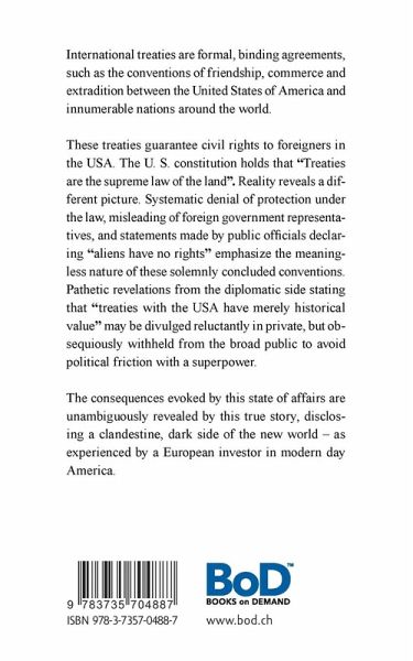 International treaties are formal, binding agreements, such as the conventions of friendship, commerce and extradition between the United States of America and innumerable nations around the world.These treaties guarantee civil rights to foreigners in the USA. The U. S. constitution holds that "Treaties are the supreme law of the land". Reality reveals a different picture. Systematic denial of protection under the law, misleading of foreign government representatives, and statements made by public officials declaring "aliens have no rights" emphasize the meaningless nature of these solemnly concluded conventions. Pathetic revelations from the diplomatic side stating that "treaties with the USA have merely historical value" may be divulged reluctantly in private, but obsequiously withheld from the broad public to avoid political friction with a superpower. The consequences evoked by this state of affairs are unambiguously revealed by this true story, disclosing a clandestine, darkside of the new world - as experienced by a European investor in modern day America.