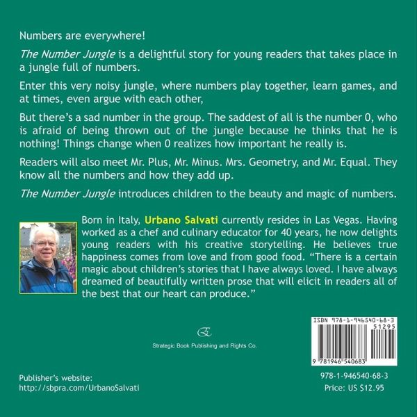 The Number Jungle is a delightful story for young readers that takes place in a jungle full of numbers. Enter this very noisy jungle, where numbers play together, learn games, and at times, even argue with each other, But there's a sad number in the group. The saddest of all is the number 0, who is afraid of being thrown out of the jungle because he thinks that he is nothing! Things change when 0 realizes how important he really is. Readers will also meet Mr. Plus, Mr. Minus. Mrs. Geometry, and Mr. Equal. They know all the numbers and how they add up. The Number Jungle introduces children to the beauty and magic of numbers. Born in Italy, Urbano Salvati currently resides in Las Vegas. Having worked as a chef and culinary educator for 40 years, he now delights young readers with his creative storytelling. He believes true happiness comes from love and from good food. "There is a certain magic about children's stories that I have always loved. I have always dreamed of beautifully written prose that will elicit in readers all of the best that our heart can produce."