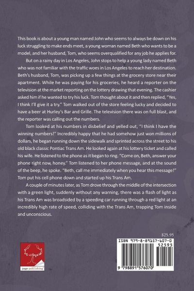 This book is about a young man named John who seems to always be down on his luck struggling to make ends meet, a young woman named Beth who wants to be a model, and her husband, Tom, who seems overqualified for any job he applies for. But on a rainy day in Los Angeles, John stops to help a young lady named Beth who was not familiar with the traffic woes in Los Angeles to reach her destination. Beth's husband, Tom, was picking up a few things at the grocery store near their apartment. While he was paying for his groceries, he heard a reporter on the television at the market reporting on the lottery drawing that evening. The cashier asked him if he wanted to try his luck. Tom thought about it and then replied, "Yes, I think I'll give it a try." Tom walked out of the store feeling lucky and decided to have a beer at Hurley's Bar and Grille. The television there was on full blast, and the reporter was calling out the numbers. Tom looked at his numbers in disbelief and yelled out, "I think I have the winning numbers!" Incredibly happy that he had somehow just won millions of dollars, he began running down the sidewalk and sprinted across the street to his old black classic Pontiac Trans Am. He looked again at his lottery ticket and called his wife. He listened to the phone as it began to ring. "Come on, Beth, answer your phone right now, honey." Tom listened to her phone message, and at the sound of the beep, he spoke. "Beth, call me immediately when you hear this message!" Tom put his cell phone down and started up his Trans Am. A couple of minutes later, as Tom drove through the middle of the intersection with a green light, suddenly without any warning, there was a flash of light as his Trans Am was broadsided by a speeding car running through a red light at an incredibly high rate of speed, colliding with the Trans Am, trapping Tom inside and unconscious.