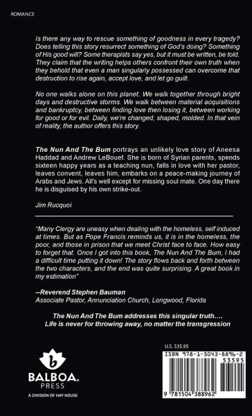 The Nun And The Bum portrays an unlikely love story of Aneesa Haddad and Andrew LeBouef. She is born of Syrian parents, spends sixteen happy years as a teaching nun, falls in love with her pastor, leaves convent, leaves him, embarks on a peace-making journey of Arabs and Jews. All?s well except for missing soul mate. One day there he is disguised by his own strike-out.
