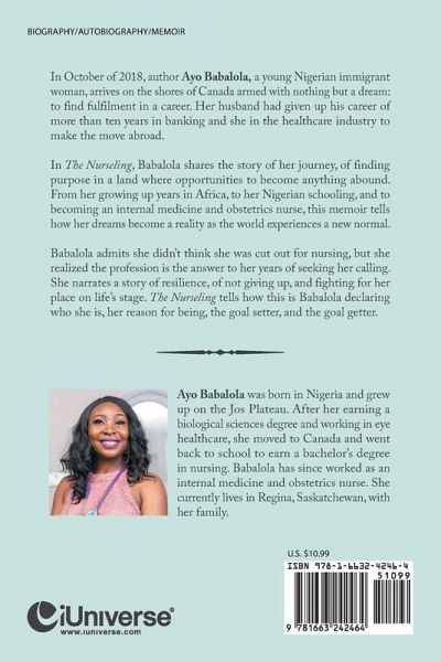 In October of 2018, author Ayo Babalola, a young Nigerian immigrant woman, arrives on the shores of Canada armed with nothing but a dream: to find fulfilment in a career. Her husband had given up his career of more than ten years in banking and she in the healthcare industry to make the move abroad. In The Nurseling, Babalola shares the story of her journey, of finding purpose in a land where opportunities to become anything abound. From her growing up years in Africa, to her Nigerian schooling, and to becoming an internal medicine and obstetrics nurse, this memoir tells how her dreams become a reality as the world experiences a new normal. Babalola admits she didn't think she was cut out for nursing, but she realized the profession is the answer to her years of seeking her calling. She narrates a story of resilience, of not giving up, and fighting for her place on life's stage. The Nurseling tells how this is Babalola declaring who she is, her reason for being, the goal setter, and the goal getter.