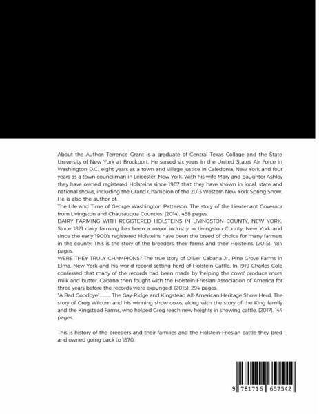 About the Author: Terrence Grant is a graduate of Central Texas Collage and the State University of New York at Brockport. He served six years in the United States Air Force in Washington D.C., eight years as a town and village justice in Caledonia, New York and four years as a town councilman in Leicester, New York. With his wife Mary and daughter Ashley they have owned registered Holsteins since 1987 that they have shown in local, state and national shows, including the Grand Champion of the 2013 Western New York Spring Show. He is also the author of: The Life and Time of George Washington Patterson. The story of the Lieutenant Governor from Livingston and Chautauqua Counties. (2014). 458 pages. DAIRY FARMING WITH REGISTERED HOLSTEINS IN LIVINGSTON COUNTY, NEW YORK. Since 1821 dairy farming has been a major industry in Livingston County, New York and since the early 1900's registered Holsteins have been the breed of choice for many farmers in the county. This is the story of the breeders, their farms and their Holsteins. (2015). 484 pages. WERE THEY TRULY CHAMPIONS? The true story of Oliver Cabana Jr., Pine Grove Farms in Elma, New York and his world record setting herd of Holstein Cattle. In 1919 Charles Cole confessed that many of the records had been made by 'helping the cows' produce more milk and butter. Cabana then fought with the Holstein-Friesian Association of America for three years before the records were expunged. (2015). 294 pages. "A Bad Goodbye"............ The Gay-Ridge and Kingstead All-American Heritage Show Herd. The story of Greg Wilcom and his winning show cows, along with the story of the King family and the Kingstead Farms, who helped Greg reach new heights in showing cattle. (2017). 144 pages. This is history of the breeders and their families and the Holstein-Friesian cattle they bred and owned going back to 1870.