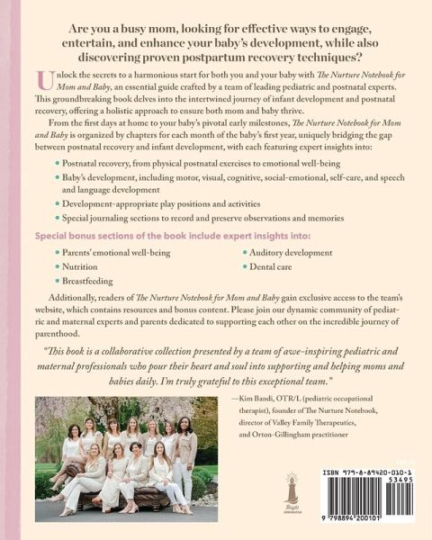Are you a busy mom, looking for effective ways to engage, entertain, and enhance your baby's development, while also discovering proven postpartum recovery techniques? Unlock the secrets to a harmonious start for both you and your baby with The Nurture Notebook for Mom and Baby, an essential guide crafted by a team of leading pediatric and postnatal experts. This groundbreaking book delves into the intertwined journey of infant development and postnatal recovery, offering a holistic approach to ensure both mom and baby thrive. From the first days at home to your baby's pivotal early milestones, The Nurture Notebook for Mom and Baby is organized by chapters for each month of the baby's first year, uniquely bridging the gap between postnatal recovery and infant development, with each featuring expert insights into: ¿ Postnatal recovery, from physical postnatal exercises to emotional well-being ¿ Baby's development, including motor, visual, cognitive, social-emotional, self-care, and speech and language development ¿ Development-appropriate play positions and activities ¿ Special journaling sections to record and preserve observations and memories Special bonus sections of the book include expert insights into: ¿ Parents' emotional well-being ¿ Nutrition ¿ Breastfeeding ¿ Auditory development ¿ Dental care Additionally, readers of The Nurture Notebook for Mom and Baby gain exclusive access to the team's website, which contains resources and bonus content. The Nurture Notebook includes contributions from more than a dozen medical experts in a wide range of fields, including: ¿ Kim Bandi, OTR/L (pediatric occupational therapist), founder of The Nurture Notebook, director of Valley Family Therapeutics, Orton-Gillingham practitioner, and photographer ¿ Sonja Burmeister, OTD, MSPA-C (physician's assistant), OTR/L (pediatric occupational therapist), EICP-OT Certified Specialist in Pediatric Early Intervention, certified autism specialist, owner of Valley Family Therapeutics, co-owner of Connective Interventions, co-founder of MyHealthcareKit ¿ Julie Spencer, PT, DPT, PCES (women's health physical therapist, pregnancy and postpartum corrective exercise specialist), co-founder of The Restoration Space ¿ Emily Cupples, DPT, pediatric physical therapist ¿ Jolie Maehrer, RN, BSN, IBCLC (lactation consultant) ¿ Kim DeWire, DMD (Doctor of Dental Medicinie), owner of DeWire Dental ¿ Jaime Henry-Heimer, MS CCC-SLP/L (pediatric speech and language pathologist), owner and CEO of Radical Speech Therapy Solutions ¿ Alison Unger, MPH, RDN, LDN, CDCES ¿ Beth Kushner-Giovenco, RN, BSN, IBCLC (lactation consultant) ¿ Danielle Kinney, homeschool mom, founder and CEO of The Confident Baker ¿ Erin Jenewein, OD, MS, FAAO, diplomatebinocular vision, perception, pediatric Optometry Associate Professor Pennsylvania College of Optometry Salus University ¿ John Page, PHD, audiologist ¿ Tracy Walters, MA, LPC (licensed professional counselor) Visit TheNurtureNotebook.com for extensive biographies of our team.