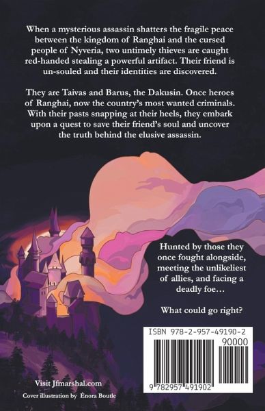 When a mysterious assassin shatters the fragile peace between the kingdom of Ranghai and the cursed people of Nyveria, two untimely thieves are caught red-handed stealing a powerful artifact. Their friend is un-souled and their identities are discovered. They are Taivas and Barus, the Dakusin. Once heroes of Ranghai, now the country's most wanted criminals. With their pasts snapping at their heels, they embark upon a quest to save their friend's soul and uncover the truth behind the elusive assassin. Hunted by those they once fought alongside, meeting the unlikeliest of allies, and facing a deadly foe… What could go right? "Barus, why do I get the feeling-" "Shush, Taivas. Just for once I'd like something to go as simple as it sounds." "Simple, huh?"