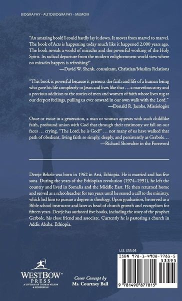 "An amazing book! I could hardly lay it down. It moves from marvel to marvel. The book of Acts is happening today much like it happened 2,000 years ago. The book reveals a world of miracles and the powerful working of the Holy Spirit. Its radical departure from the modern enlightenment world view where no miracles happen is refreshing!" -David W. Shenk, consultant, Christian/Muslim Relations "This book is powerful because it presents the faith and life of a human being who gave his life completely to Jesus and lives like that ... a marvelous story and a precious addition to the stories of men and women of faith whose lives tug at our deepest feelings, pulling us ever onward in our own walk with the Lord." -Donald R. Jacobs, Missiologist Once or twice in a generation, a man or woman appears with such childlike faith, profound union with God that through their testimony we fall on our faces ... crying, "The Lord, he is God!" ... not many of us have walked that path of obedient, living faith so simply, deeply, and persistently as Gerbole... -Richard Showalter in the Foreword