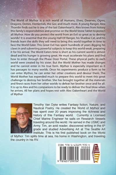 The World of Mythor is a rich world of Humans, Elves, Dwarves, Ogres, Dragons, Deities, Elementals, the Gor, and much more. A young Ranger, Alex Thornlin finds out he is one of the last Oakenheart's. Alex knows from history this family's responsibilities and promise on the World Stone Tablet to protect all Mythor. How do you protect the world from an Evil so great as to destroy worlds? It is essential that this young Half-Elf Ranger, his Shadow Cat, and his friends learn the skills they will need to bring this world together in time to face the World Eater. This Great Evil has spent hundreds of years digging his claws in and subverting powerful subjects to keep this world weak, preparing it for his arrival. The World Eaters time is short as his current world is almost dead and his hunger is growing great. He must accelerate his plans and find how to enter through the Phase Door Portal. These physical paths to each world were created by his sister. But the World Mother has made changes and he cannot enter in his true form. Mythor is especially important as it has passages to many worlds. Once his experiments produce a form so he can enter Mythor, he can enter her other creations and devour them. The World Mother has expended much to prepare this world to meet this great challenge to destroy her brother. She has brought together all the materials and finest races from her other worlds to defeat her brother once and for all. It is up to Alex and his companions to be ready to deliver the final blow when he arrives. All her plans and hopes rest with Alex Oakenheart and the World of Mythor Timothy Van Dyke writes Fantasy fiction, Nature, and Nautical Poetry. He created the World of Mythor and has spent over 20 years improving the richness and history of this Fantasy world. Currently a Licensed Chief Marine Engineer he sails on Research Vessels traveling around the world. He served in the USMC and Army. Tim, an avid reader, discovered writing in the 6th grade and studied Advertising Art at The Seattle Art Institute. This is his first published book on the World of Mythor. Tim splits time at sea, his home in Washington, and traveling the country in his RV.