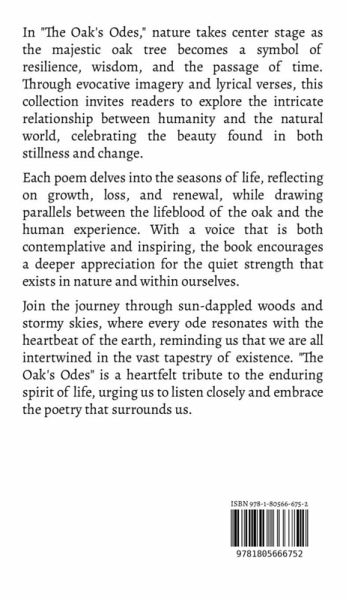 In "The Oak's Odes," nature takes center stage as the majestic oak tree becomes a symbol of resilience, wisdom, and the passage of time. Through evocative imagery and lyrical verses, this collection invites readers to explore the intricate relationship between humanity and the natural world, celebrating the beauty found in both stillness and change. Each poem delves into the seasons of life, reflecting on growth, loss, and renewal, while drawing parallels between the lifeblood of the oak and the human experience. With a voice that is both contemplative and inspiring, the book encourages a deeper appreciation for the quiet strength that exists in nature and within ourselves. Join the journey through sun-dappled woods and stormy skies, where every ode resonates with the heartbeat of the earth, reminding us that we are all intertwined in the vast tapestry of existence. "The Oak's Odes" is a heartfelt tribute to the enduring spirit of life, urging us to listen closely and embrace the poetry that surrounds us.