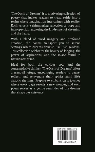 "The Oasis of Dreams" is a captivating collection of poetry that invites readers to tread softly into a realm where imagination intertwines with reality. Each verse is a shimmering reflection of hope and introspection, exploring the landscapes of the mind and the heart. With a blend of vivid imagery and profound emotion, the poems transport you to serene settings where dreams flourish like lush gardens. This collection celebrates the beauty of longing, the power of aspirations, and the solace found in nature's embrace. Ideal for both the curious soul and the contemplative thinker, "The Oasis of Dreams" offers a tranquil refuge, encouraging readers to pause, reflect, and rejuvenate their spirits amid life's chaotic rhythms. Prepare to embark on a journey where every page reveals a new wonder, and each poem serves as a gentle reminder of the dreams that shape our existence.