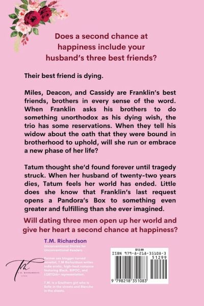 Does a second chance at happiness include your husband's three best friends? Miles, Deacon, and Cassidy are Franklin's best friends, brothers in every sense of the word. When Franklin asks his brothers to do something unorthodox as his dying wish, the trio has some reservations. When they tell his widow about the oath that they were bound in brotherhood to uphold, will she run or embrace a new phase of her life that includes the three of them? Tatum thought she'd found forever until tragedy struck. When her husband of twenty-two years dies, Tatum feels her world has ended. Little does she know that Franklin's last request opens a Pandora's Box to something even greater and fulfilling than she ever imagined. Will dating three men open up her world and give her heart a second chance at happiness¿?
