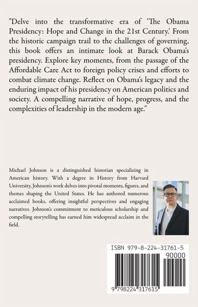 "Delve into the transformative era of 'The Obama Presidency: Hope and Change in the 21st Century.' From the historic campaign trail to the challenges of governing, this book offers an intimate look at Barack Obama's presidency. Explore key moments, from the passage of the Affordable Care Act to foreign policy crises and efforts to combat climate change. Reflect on Obama's legacy and the enduring impact of his presidency on American politics and society. A compelling narrative of hope, progress, and the complexities of leadership in the modern age."