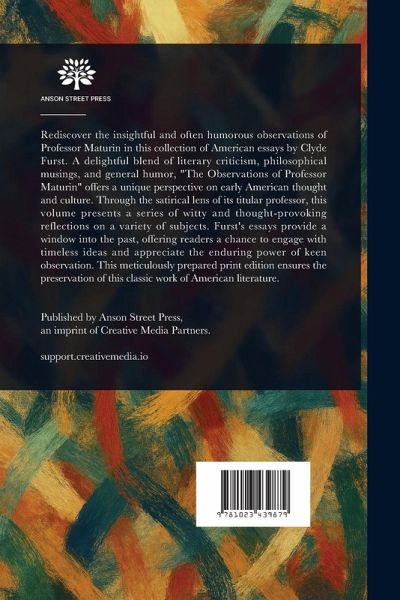 Rediscover the insightful and often humorous observations of Professor Maturin in this collection of American essays by Clyde Furst. A delightful blend of literary criticism, philosophical musings, and general humor, "The Observations of Professor Maturin" offers a unique perspective on early American thought and culture. Through the satirical lens of its titular professor, this volume presents a series of witty and thought-provoking reflections on a variety of subjects. Furst's essays provide a window into the past, offering readers a chance to engage with timeless ideas and appreciate the enduring power of keen observation. This meticulously prepared print edition ensures the preservation of this classic work of American literature. This work has been selected by scholars as being culturally important, and is part of the knowledge base of civilization as we know it. This work is in the public domain in the United States of America, and possibly other nations. Within the United States, you may freely copy and distribute this work, as no entity (individual or corporate) has a copyright on the body of the work. Scholars believe, and we concur, that this work is important enough to be preserved, reproduced, and made generally available to the public. We appreciate your support of the preservation process, and thank you for being an important part of keeping this knowledge alive and relevant.