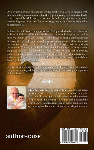 On a winter morning, an engineer invites his three children to descend with him into a deep diamond mine. On this trip, the youngest son finds a black-stained crystal. In adulthood, he donates his find to a city museum where it remains forgotten in a drawer for a century, gathering dust among many other mineral samples. Professor Adam Chonsp is a renowned astrobiologist who has been searching for evidence of life beyond Earth for decades. One day when he stops by the London History Museum to collect samples of asteroids rich in organic compounds that have recently arrived from Japan, he learns that someone with his maternal surname once donated a rare crystal filled with fossilized genetic memories to the museum. Curious, he finds where the gem is kept, opens the dusty drawer, and places the mysterious crystal in his pocket. After returning to the university, Chonsp embarks on a determined quest to analyze the crystal and learn more without any idea that he is about to make an amazing discovery that leads him down a path he never expected. In this exciting science fiction adventure, an astrobiologist and his students study an ancient crystal that may just hold the key to uncovering the mysteries of the universe.
