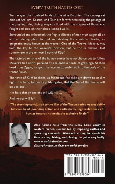 Every Truth Has Its Cost. War ravages the troubled lands of the nine Baronies. The once-great cities of Arelium, Kessrin, and Talth are forever scarred by the passage of the greyling tide, their graveyards filled with the corpses of those who fought and died on their blood-stained walls. Surrounded and exhausted, the fragile alliance of men must wager all on a final, daring plan: to find and destroy the creatures' leader, an enigmatic entity known as the weaver. One of the Twelve, Makara, may hold the key to the weaver's location, but he too is missing, lost somewhere in the remote Barony of Klief. The tattered remains of the human armies have no choice but to follow Makara's trail north, pursued by a relentless horde of greylings. At their head rides Zygos, his god-like intellect transferred into the body of the traitor Praxis. The town of Klief beckons, as friend and foe alike are drawn to its dim light. It is here, before its golden gates, that the War of the Twelve will be decided. It is here that an ancient evil will rise ... And heroes will fall.