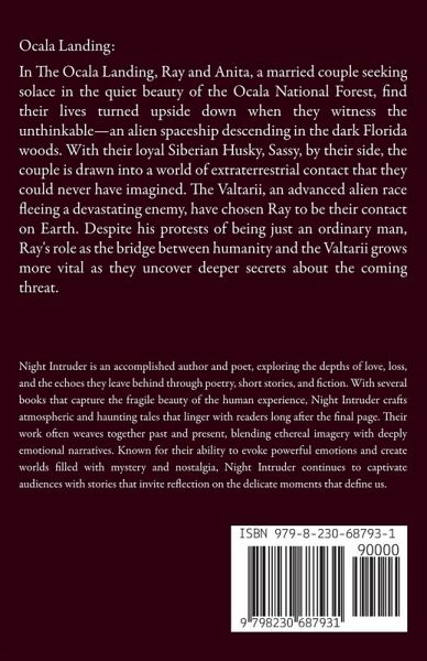 Ocala Landing: In The Ocala Landing, Ray and Anita, a married couple seeking solace in the quiet beauty of the Ocala National Forest, find their lives turned upside down when they witness the unthinkable-an alien spaceship descending in the dark Florida woods. With their loyal Siberian Husky, Sassy, by their side, the couple is drawn into a world of extraterrestrial contact that they could never have imagined. The Valtarii, an advanced alien race fleeing a devastating enemy, have chosen Ray to be their contact on Earth. Despite his protests of being just an ordinary man, Ray's role as the bridge between humanity and the Valtarii grows more vital as they uncover deeper secrets about the coming threat.