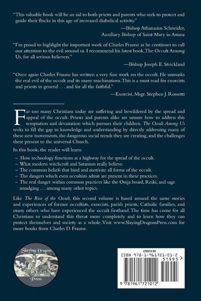 On the heels of the moral and spiritual collapse in the second half of the twentieth century, a new interest in spirituality has emerged and is overwhelming the world. However, this interest is not one which is leading to a resurgence of Christian faith and holiness. It is one in which man is infatuated with spirits, aligned with secret powers, inclined to secret rituals, and in love with superstition. Far too many Christians today are suffering and bewildered by the spread and appeal of the occult. Priests and parents alike are unsure how to address this temptation and devastation which pursues their children. The Occult Among Us seeks to fill the gap in knowledge and understanding by directly addressing many of these new movements, the dangerous social trends they are creating, and the challenges these present to the universal Church. In this book, the reader will learn:How technology functions as a highway for the spread of the occult. What modern witchcraft and Satanism really believe. The common beliefs that bind and motivate all forms of the occult. The dangers which even occultists admit are present in these practices. The real danger within common practices like the Ouija board, Reiki, and sage smudging ... among many other topics. Like The Rise of the Occult, this second volume is based around the same stories and experiences of sixteen former occultists, eight exorcists, seven parish priests, six Catholic families, and many others who have experienced firsthand the presence and dangers and reality of the modern-day resurgence of the occult. The time has come for all Christians to understand this threat more completely and to learn how they can protect themselves and society as a whole. ~ Charles D. Fraune is an author, teacher, and speaker with a Master of Arts in Theology and an Advanced Apostolic Catechetical Diploma. He is the author of the best-selling spiritual warfare books - Slaying Dragons: What Exorcists See & What We Should Know and The Rise of the Occult: What Exorcists & Former Occultists Want You To Know, both of which have been endorsed by Bishop Athanasius Schneider, Bishop Joseph Strickland, and exorcist Msgr. Stephen Rossetti. Find him and his other publications at www.SlayingDragonsPress.com.