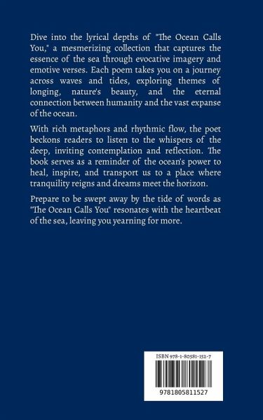 Dive into the lyrical depths of "The Ocean Calls You," a mesmerizing collection that captures the essence of the sea through evocative imagery and emotive verses. Each poem takes you on a journey across waves and tides, exploring themes of longing, nature's beauty, and the eternal connection between humanity and the vast expanse of the ocean. With rich metaphors and rhythmic flow, the poet beckons readers to listen to the whispers of the deep, inviting contemplation and reflection. The book serves as a reminder of the ocean's power to heal, inspire, and transport us to a place where tranquility reigns and dreams meet the horizon. Prepare to be swept away by the tide of words as "The Ocean Calls You" resonates with the heartbeat of the sea, leaving you yearning for more.