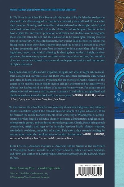 In The Ocean in the School Rick Bonus tells the stories of Pacific Islander students as they and their allies struggled to transform a university they believed did not value their presence. Drawing on dozens of interviews with students he taught, advised, and mentored between 2004 and 2018 at the University of Washington, Bonus outlines how, despite the university's promotion of diversity and student success programs, these students often did not find their education to be meaningful, leading some to leave the university. As these students note, they weren't failing school; the school was failing them. Bonus shows how students employed the ocean as a metaphor as a way to foster community and to transform the university into a space that valued meaningfulness, respect, and critical thinking. In sharing these students' insights and experiences, Bonus opens up questions about measuring student success, the centrality of antiracism and social justice to structurally reshaping universities, and the purpose of higher education.