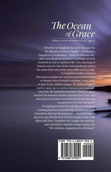 Tributes to Amma's All-Embracing Love. "Whether we laugh or cry, days will pass by. So why not choose to laugh?" Amma says,"Happiness is a decision." Many of Amma's children have faced tremendous hardships in both material as well as spiritual life. This teaching of Amma's may be one of the most profound and at the same time one of the most difficult to accept. Is happiness really a choice? This book contains the transformational journeys of twenty-five of Amma's children. Every story is real. Every child is unique. So many struggled hard to open up to receive Amma's pure and selfless love. Yet somehow an inner transformation started the moment Amma touched their lives, and each person in their own time eventually became receptive to her love and grace. Accepting Amma's love and grace is always a turning point in everyone's life. As we read these chronicles that her devotees have offered in love, it removes any doubts that we too can grow into a life filled with love. Therefore let's laugh with enthusiasm and follow Amma's loving clarion call: "My children, happiness is a decision!" Published By The Disciples Of Mata Amritanandamayi Devi, Affectionately Known As Mother, Or Amma The Hugging Saint.