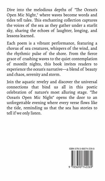 Dive into the melodious depths of "The Ocean's Open Mic Night," where waves become words and tides tell tales. This enchanting collection captures the voices of the sea as they gather under a starlit sky, sharing the echoes of laughter, longing, and lessons learned. Each poem is a vibrant performance, featuring a chorus of sea creatures, whispers of the wind, and the rhythmic pulse of the shore. From the fierce grace of crashing waves to the quiet contemplation of moonlit nights, this book invites readers to experience the ocean's narrative-a blend of beauty and chaos, serenity and storm. Join the aquatic revelry and discover the universal connections that bind us all in this poetic celebration of nature's most alluring stage. "The Ocean's Open Mic Night" opens the door to an unforgettable evening where every verse flows like the tide, reminding us that the sea has stories to tell if we only listen.