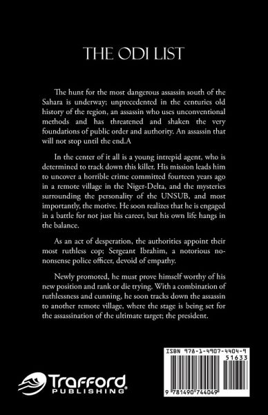 The hunt for the most dangerous assassin south of the Sahara is underway; unprecedented in the centuries old history of the region, an assassin who uses unconventional methods and has threatened and shaken the very foundations of public order and authority. An assassin that will not stop until the end.A In the center of it all is a young intrepid agent, who is determined to track down this killer. His mission leads him to uncover a horrible crime committed fourteen years ago in a remote village in the Niger-Delta, and the mysteries surrounding the personality of the UNSUB, and most importantly, the motive. He soon realizes that he is engaged in a battle for not just his career, but his own life hangs in the balance. As an act of desperation, the authorities appoint their most ruthless cop; Sergeant Ibrahim, a notorious no-nonsense police officer, devoid of empathy. Newly promoted, he must prove himself worthy of his new position and rank or die trying. With a combination of ruthlessness and cunning, he soon tracks down the assassin to another remote village, where the stage is being set for the assassination of the ultimate target; the president.