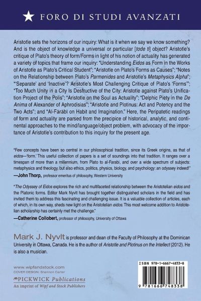 Aristotle sets the horizons of our inquiry: What is it when we say we know something? And is the object of knowledge a universal or particular [tode ti] object? Aristotle's critique of Plato's theory of form/Forms in light of his notion of actuality has generated a variety of topics that frame our inquiry: "Understanding Eidos as Form in the Works of Aristotle as Plato's Critical Student"; "Aristotle on Plato's Forms as Causes"; "Notes on the Relationship between Plato's Parmenides and Aristotle's Metaphysics Alpha"; "'Separate' and 'Inactive'? Aristotle's Most Challenging Critique of Plato's 'Forms'"; "Too Much Unity in a City Is Destructive of the City: Aristotle against Plato's Unification Project of the Polis"; "Aristotle on the Soul as Actuality"; "Delphic Piety in the De Anima of Alexander of Aphrodisias"; "Aristotle and Plotinus: Act and Potency and the Two Acts"; and "Al-F¿r¿b¿on Habit and Imagination." Here, the Peripatetic readings of form and actuality are parsed from the precipice of historical, analytic, and continental approaches to the mind/language/object problem, with advocacy of the importance of Aristotle's contribution to this inquiry for the present age.
