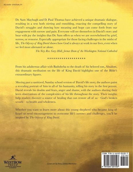 Dr. Sam Mayhugh and D. Paul Thomas have achieved a unique dramatic dialogue, resulting in a text both stirring and ennobling, enacting the compelling story of David's struggles and showing how meaning and hope can come forth from our engagement with sorrow and pain. Everyone will see themselves in David's story and hear with joy the insights that Dr. Sam offers us when we are overwhelmed by grief, sorrow, or remorse. Especially appropriate for those facing challenges in the midst of life, The Odyssey of King David shows how God is always at work in our lives, even when we feel most alienated or alone. The Very Rev. Gary Hall, former Dean of the Washington National Cathedral * * * * * * * * * * * * * * * * * * * From his adulterous affair with Bathsheba to the death of his beloved son, Absalom, this dramatic meditation on the life of King David highlights one of the Bible's extraordinary figures. Moving past a sanitized, Sunday school version of David's life story, the authors paint a revealing portrait of him in all of his humanity, telling his story in the first person. David reveals his doubts and fears, anger and shame, with the authors sharing their keen observations of the complexities of his life throughout the story. Their insights help readers discover a source of healing that can restore all of us-God's broken vessels-to health and wholeness. Whether you want to learn more about this young shepherd who became king of Israel or need encouragement to overcome life's sorrows and challenges, you'll be inspired by The Odyssey of King David.