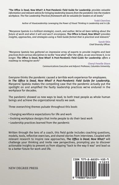Everyone thinks the pandemic caused a terrible work experience for employees. In The Office is Dead, Now What? A Post-Pandemic Field Guide for Leadership, Maryanne Spatola makes the compelling case that the pandemic actually put the spotlight on and amplified the faulty leadership practices we've endured in the workplace for decades. The pandemic showed us new ways to lead, to both treat people as whole human beings and achieve the organizational results we seek. Three overarching themes pulsate throughout this book: Changing workforce expectations for life and work Evolving workplace designs that invite people to do their best work Leadership practices learned from the pandemic Written through the lens of a coach, this field guide includes coaching questions, models, tools, reflective exercises, and shared stories from interviews. Coupled with relevant research to inspire new approaches, The Office is Dead, Now What? will challenge your thinking and invite new perspectives, prompting you to discover actionable insights to prevent us from slipping "back to the way it was" and lead us to a better future for work and life.