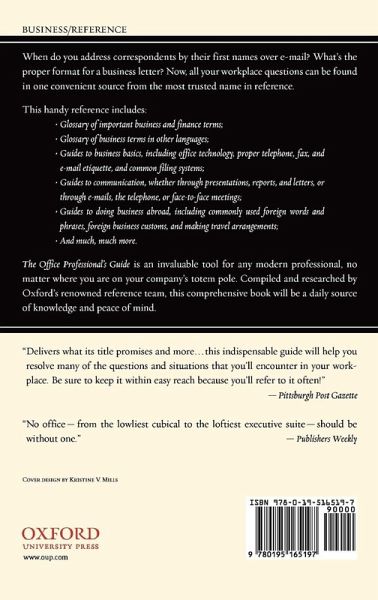 When do you address correspondents by their first names over email? Need a refresher on the proper format for a business letter? Or perhaps a cram-course on how business is conducted in a particular foreign country? Now, all your workplace questions can be found in one convenient source from the most trusted name in reference. The Office Professional's Guide takes you through office basics (frequently misspelled words; proper telephone, fax, and email etiquette; common filing systems), important business and financial concepts (P&L, ROI, price to earnings ratio), international business (a glossary of terms in five different languages; a guide to travel arrangements), giving presentations (with PowerPoint), making meeting arrangements, and much more. The Office Professional's Guide is an invaluable tool for any modern professional, no matter how high you are on your department's totem pole. Compiled and researched by Oxford's renowned reference team, this comprehensive book will be a daily source of knowledge and peace of mind.
