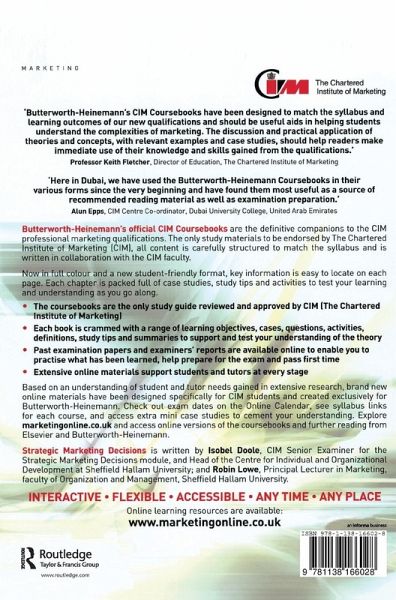 'Butterworth-Heinemann's CIM Coursebooks have been designed to match the syllabus and learning outcomes of our new qualifications and should be useful aids in helping students understand the complexities of marketing. The discussion and practical application of theories and concepts, with relevant examples and case studies, should help readers make immediate use of their knowledge and skills gained from the qualifications.'Professor Keith Fletcher, Director of Education, The Chartered Institute of Marketing'Here in Dubai, we have used the Butterworth-Heinemann Coursebooks in their various forms since the very beginning and have found them most useful as a source of recommended reading material as well as examination preparation.'Alun Epps, CIM Centre Co-ordinator, Dubai University College, United Arab EmiratesButterworth-Heinemann's official CIM Coursebooks are the definitive companions to the CIM professional marketing qualifications. The only study materials to be endorsed by The Chartered Institute of Marketing (CIM), all content is carefully structured to match the syllabus and is written in collaboration with the CIM faculty. Now in full colour and a new student friendly format, key information is easy to locate on each page. Each chapter is packed full of case studies, study tips and activities to test your learning and understanding as you go along. ¿The coursebooks are the only study guide reviewed and approved by CIM (The Chartered Institute of Marketing). ¿Each book is crammed with a range of learning objectives, cases, questions, activities, definitions, study tips and summaries to support and test your understanding of the theory. ¿Past examination papers and examiners' reports are available online to enable you to practise what has been learned and help prepare for the exam and pass first time. ¿Extensive online materials support students and tutors at every stage. Based on an understanding of student and tutor needs gained in extensive research, brand new online materials have been designed specifically for CIM students and created exclusively for Butterworth-Heinemann. Check out exam dates on the Online Calendar, see syllabus links for each course, and access extra mini case studies to cement your understanding. Explore marketingonline.co.uk and access online versions of the coursebooks and further reading from Elsevier and Butterworth-Heinemann.INTERACTIVE, FLEXIBLE, ACCESSIBLE ANY TIME, ANY PLACEwww.marketingonline.co.uk