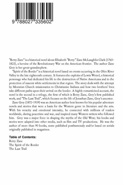 "Betty Zane" is a historical novel about Elizabeth "Betty" Zane McLaughlin Clark (1765-1823), a heroine of the Revolutionary War on the American frontier. The author Zane Grey is her great-grandnephew. "Spirit of the Border" is a historical novel based on events occurring in the Ohio River Valley in the late eighteenth century. It features the exploits of Lewis Wetzel, a historical personage who had dedicated his life to the destruction of Native Americans and to the protection of nascent white settlements in that region. The story deals with the attempt by Moravian Church missionaries to Christianize Indians and how two brothers' lives take different paths upon their arrival on the border. A highly romanticized account, the novel is the second in a trilogy, the first of which is Betty Zane, Grey's first published work, and "The Last Trail", which focuses on the life of Jonathan Zane, Grey's ancestor. Zane Grey (1872-1939) was an American author best known for his popular adventure novels and stories that were a basis for the Western genre in literature and the arts. With his veracity and emotional intensity, he connected with millions of readers worldwide, during peacetime and war, and inspired many Western writers who followed him. Grey was a major force in shaping the myths of the Old West; his books and stories were adapted into other media, such as film and TV productions. He was the author of more than 90 books, some published posthumously and/or based on serials originally published in magazines. Table of Contents: - Betty Zane - The Spirit of the Border - The Last Trail