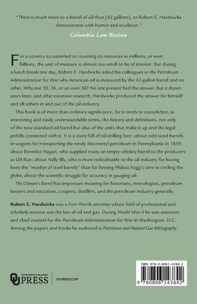 For a country accustomed to counting its resources in millions, or even billions, the unit of measure is almost too small to be of interest. But during a lunch break one day, Robert E. Hardwicke asked of his colleagues in the Petroleum Administration for War why American oil is measured by the 42-gallon barrel and no other. Why not 30, 36, or an even 50? No one present had the answer, but a dozen years later, and after extensive research, Hardwicke produced the answer for himself and all others in and out of the oil industry. This book is of more than ordinary significance, for it tends to consolidate, in interesting and easily understandable terms, the history and definitions, not only of the now-standard oil barrel but also of the units that make it up and the legal pitfalls connected with it. It is a story full of oil-drilling lore-about odd-sized barrels in wagons for transporting the newly discovered petroleum in Pennsylvania in 1859; about Benedict Hagan, who supplied many an empty whiskey barrel to the producers at Oil Run; about Nelly Bly, who is more redoubtable to the oil industry for having been the "mother of steel barrels" than for besting Phileas Fogg's time in circling the globe; about the scientific struggle for accuracy in gauging oil. The Oilman's Barrel has important meaning for historians, metrologists, petroleum lawyers and executives, coopers, distillers, and the petroleum industry generally. "There is much more to a barrel of oil than [42 gallons], as Robert E. Hardewicke demonstrates with humor and erudition." Columbia Law Review Robert E. Hardwicke was a Fort Worth attorney whose field of professional and scholarly interest was the law of oil and gas. During World War II he was associate and chief counsel for the Petroleum Administration for War in Washington, D.C. Among the papers and books he authored is Petroleum and Natural Gas Bibliography. On the front:
