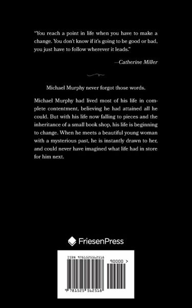 "You reach a point in life when you have to make a change. You don't know if it's going to be good or bad, you just have to follow wherever it leads." -Catherine Miller Michael Murphy never forgot those words. Michael Murphy had lived most of his life in complete contentment, believing he had attained all he could. But with his life now falling to pieces and the inheritance of a small book shop, his life is beginning to change. When he meets a beautiful young woman with a mysterious past, he is instantly drawn to her, and could never have imagined what life had in store for him next.