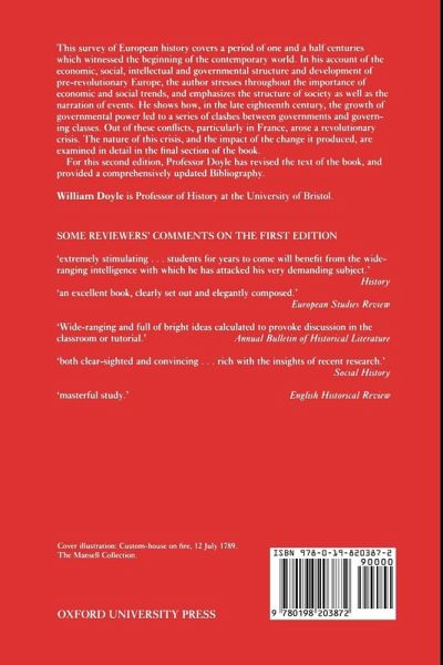 This survey of European history covers a period of one and a half centuries which witnessed the beginnings of the contemporary world. In his account of the economic, social, intellectual and governmental structure and development of pre-revolutionary Europe, the author stresses throughout the importance of economic and social trends, and places emphasis on the analysis of the structure of society as well as the narration of events. He shows how the contradictions of the old order contributed to a crisis which affected several of the major states in the late eighteenth century, when the growth of governmental power led to a series of clashes between governments and governing classes. Out of these conflicts, particularly in France, arose a revolutionary crisis. The nature of this crisis, and the impact of the change it produced, are examined in detail in the final section of the book. For this second edition, Professor Doyle has revised the text of the book, and comprehensively updated the Bibliography.