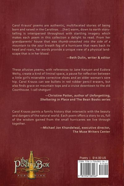 Carol Parris Krauss weaves stories of North Carolina and South Carolina through various people and places. Her poems are a glimpse into the place the Old Folk's call "God's Country." From looking outside her grandparent's home in Brevard, North Carolina to recounting her sister's journey to a cottage at Pawleys Island, the reader can travel with her on this journey of recognition and recollection. "Carol Krauss' poems are authentic, multifaceted stories of being born and raised in the Carolinas. ...[her] warm, down to earth storytelling is interspersed throughout with startling imagery which makes each poem in this collection a delight to read. From her grandparents' house that was thumb-smashed into the side of a mountain to the sour breath fog of a hurricane that rears back its head and roars, her words provide a unique view of a physical landscape that is in her blood." -Beth Dulin, writer & editor "These allusive poems, with references to Jane Kenyon and Eudora Welty, create a kind of liminal space, a pause for reflection between a little girl's miserable corrective shoes and an older woman's sore hip. Carol Krauss can see bullets in red rubber pencil erasers, but also finds grace on mountain tops and a cruise downtown to the old Courthouse. I call shotgun!" -Christine Potter, author of Unforgetting,Sheltering in Place and The Bean Books series "Carol Krauss paints a family history that intersects with the beauty and dangers of the natural world. Each poem offers a story to us, full of the wisdom gained from the small hurricanes we live through together." -Michael Jon Khandelwal, executive director, The Muse Writers Center