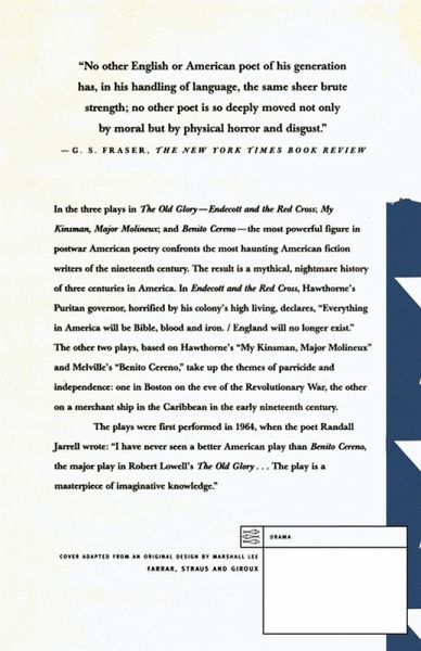 Winner of Five Obies, now back in print after fifteen years, a stage adaptation of classic stories by Hawthorne and Melville In the three plays in The Old Glory--Endecott and the Red Cross; My Kinsman, Major Molineux; and Benito Cereno--the most powerful figure in postwar American poetry confronts the most haunting American fiction writers of the nineteenth century. The result is a mythical, nightmare history of three centuries in America. In Endecott and the Red Cross, Hawthorne's Puritan governor, horrified by his colony's high living, declares, "Everything in America will be Bible, blood and iron. / England will no longer exist." The other two plays, based on Hawthorne's My Kinsman, Major Molineux and Melville's Benito Cereno, take up the themes of parricide and independence: one in Boston on the eve of the Revolutionary War, the other on a merchant ship in the Caribbean in the early nineteenth century. The plays were first performed in 1964, when the poet Randall Jarrell wrote: "I have never seen a better American play than Benito Cereno, the major play in Robert Lowell's The Old Glory . . . The play is a masterpiece of imaginative knowledge."