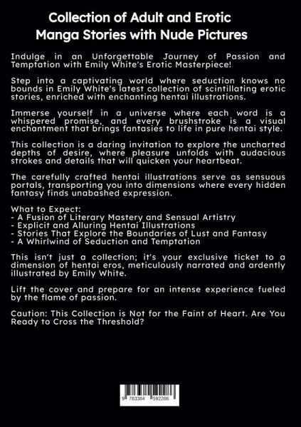 Indulge in an Unforgettable Journey of Passion and Temptation with Emily White's Erotic Masterpiece!Step into a captivating world where seduction knows no bounds in Emily White's latest collection of scintillating erotic stories, enriched with enchanting hentai illustrations. Immerse yourself in a universe where each word is a whispered promise, and every brushstroke is a visual enchantment that brings fantasies to life in pure hentai style.This collection is a daring invitation to explore the uncharted depths of desire, where pleasure unfolds with audacious strokes and details that will quicken your heartbeat. The carefully crafted hentai illustrations serve as sensuous portals, transporting you into dimensions where every hidden fantasy finds unabashed expression.What to Expect:- A Fusion of Literary Mastery and Sensual Artistry- Explicit and Alluring Hentai Illustrations- Stories That Explore the Boundaries of Lust and Fantasy- A Whirlwind of Seduction and TemptationThis isn'tjust a collection; it's your exclusive ticket to a dimension of hentai eros, meticulously narrated and ardently illustrated by Emily White. Lift the cover and prepare for an intense experience fueled by the flame of passion.Caution: This Collection is Not for the Faint of Heart. Are You Ready to Cross the Threshold?