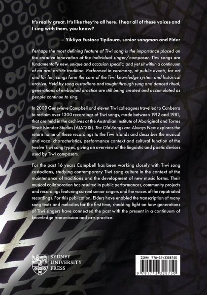 It's really great. It's like they're all here. I hear all of these voices and I sing with them, you know? - Yikliya Eustace Tipiloura, senior songman and Elder Perhaps the most defining feature of Tiwi song is the importance placed on the creative innovation of the individual singer/composer. Tiwi songs are fundamentally new, unique and occasion specific, and yet sit within a continuum of an oral artistic tradition. Performed in ceremony, at public events, for art and for fun, songs form the core of the Tiwi knowledge system and historical archive. Held by song custodians and taught through sung and danced ritual, generations of embodied practice are still being created and accumulated as people continue to sing. In 2009 Genevieve Campbell and eleven Tiwi colleagues travelled to Canberra to reclaim over 1300 recordings of Tiwi songs, made between 1912 and 1981, that are held in the archives at the Australian Institute of Aboriginal and Torres Strait Islander Studies (AIATSIS). The Old Songs are Always New explores the return home of these recordings to the Tiwi Islands and describes the musical and vocal characteristics, performance context and cultural function of the twelve Tiwi song types, giving an overview of the linguistic and poetic devices used by Tiwi composers. For the past 16 years Campbell has been working closely with Tiwi song custodians, studying contemporary Tiwi song culture in the context of the maintenance of traditions and the development of new music forms. Their musical collaboration has resulted in public performances, community projects and recordings featuring current senior singers and the voices of the repatriated recordings. For this publication, Elders have enabled the transcription of many song texts and melodies for the first time, shedding light on how generations of Tiwi singers have connected the past with the present in a continuum of knowledge transmission and arts practice.