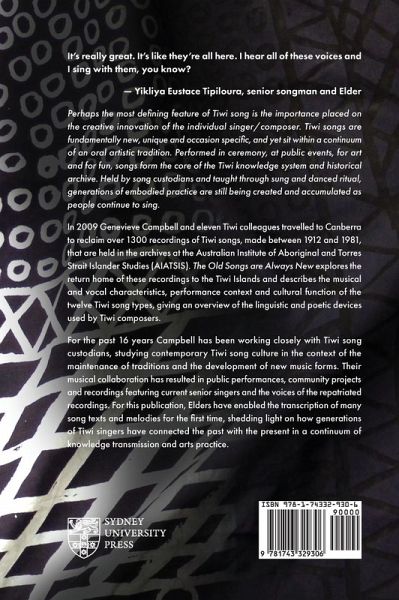 It's really great. It's like they're all here. I hear all of these voices and I sing with them, you know? - Yikliya Eustace Tipiloura, senior songman and Elder Perhaps the most defining feature of Tiwi song is the importance placed on the creative innovation of the individual singer/composer. Tiwi songs are fundamentally new, unique and occasion specific, and yet sit within a continuum of an oral artistic tradition. Performed in ceremony, at public events, for art and for fun, songs form the core of the Tiwi knowledge system and historical archive. Held by song custodians and taught through sung and danced ritual, generations of embodied practice are still being created and accumulated as people continue to sing. In 2009 Genevieve Campbell and eleven Tiwi colleagues travelled to Canberra to reclaim over 1300 recordings of Tiwi songs, made between 1912 and 1981, that are held in the archives at the Australian Institute of Aboriginal and Torres Strait Islander Studies (AIATSIS). The Old Songs are Always New explores the return home of these recordings to the Tiwi Islands and describes the musical and vocal characteristics, performance context and cultural function of the twelve Tiwi song types, giving an overview of the linguistic and poetic devices used by Tiwi composers. For the past 16 years Campbell has been working closely with Tiwi song custodians, studying contemporary Tiwi song culture in the context of the maintenance of traditions and the development of new music forms. Their musical collaboration has resulted in public performances, community projects and recordings featuring current senior singers and the voices of the repatriated recordings. For this publication, Elders have enabled the transcription of many song texts and melodies for the first time, shedding light on how generations of Tiwi singers have connected the past with the present in a continuum of knowledge transmission and arts practice.