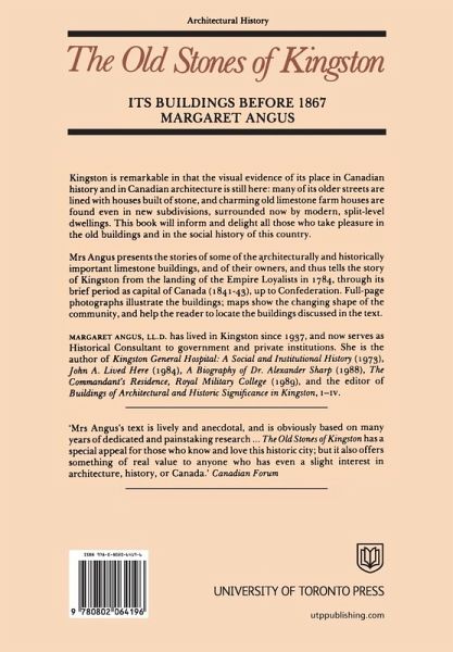 Margaret Angus presents the stories of some of the architecturally and historically important limestone buildings, and of their owners, and thus tells the story of Kingston from the landing of the Empire Loyalists in 1784, through its brief period as capital of Canada (1841-43) up to Confederation.