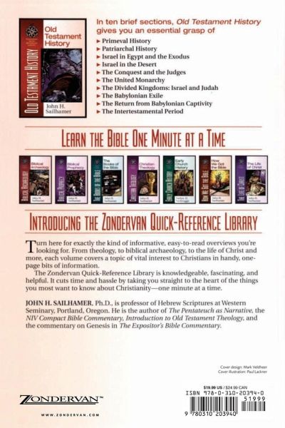 In brief sections, this book gives an overview of the Old Testament of the Bible--from the primeval history to the period after the Babylonian captivity. When busy people want to know more about the Bible and the Christian faith, the Zondervan Quick-Reference Library offers an instant information alternative in a manageable length. Covering the basics of the faith and Bible knowledge in an easy-to-use format, this series helps new Christians and seasoned believers alike find answers to their questions about Christianity and the Bible. The information in Old Testament History is presented in units of one or two pages, so that each section can be read in a few minutes, covering: The creation account. The patriarchal history. The Exodus and Israel in the desert. The Judges and the united monarchy. The divided kingdoms. The Babylonian exile. The Intertestamental period. The Zondervan Quick-Reference Library makes important knowledge affordable, accessible, and easy to understand for busy people who don't have a lot of time to read or study.