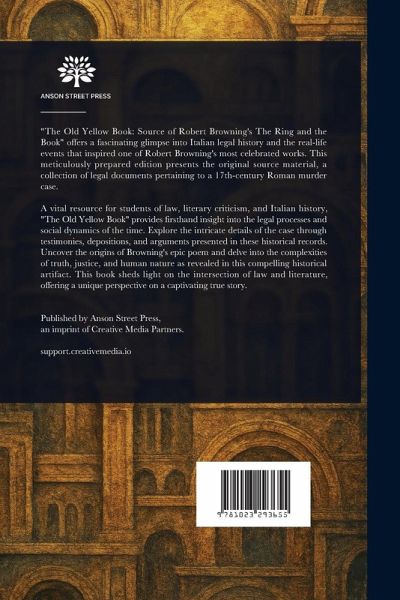 "The Old Yellow Book: Source of Robert Browning's The Ring and the Book" offers a fascinating glimpse into Italian legal history and the real-life events that inspired one of Robert Browning's most celebrated works. This meticulously prepared edition presents the original source material, a collection of legal documents pertaining to a 17th-century Roman murder case. A vital resource for students of law, literary criticism, and Italian history, "The Old Yellow Book" provides firsthand insight into the legal processes and social dynamics of the time. Explore the intricate details of the case through testimonies, depositions, and arguments presented in these historical records. Uncover the origins of Browning's epic poem and delve into the complexities of truth, justice, and human nature as revealed in this compelling historical artifact. This book sheds light on the intersection of law and literature, offering a unique perspective on a captivating true story. This work has been selected by scholars as being culturally important, and is part of the knowledge base of civilization as we know it. This work is in the public domain in the United States of America, and possibly other nations. Within the United States, you may freely copy and distribute this work, as no entity (individual or corporate) has a copyright on the body of the work. Scholars believe, and we concur, that this work is important enough to be preserved, reproduced, and made generally available to the public. We appreciate your support of the preservation process, and thank you for being an important part of keeping this knowledge alive and relevant.